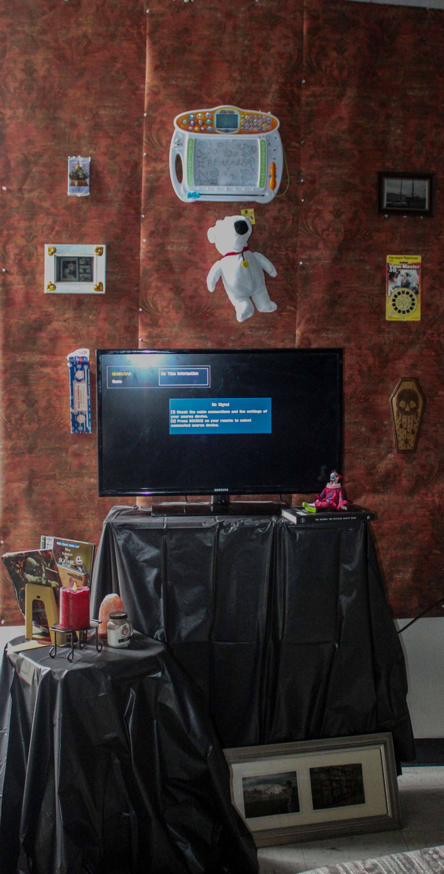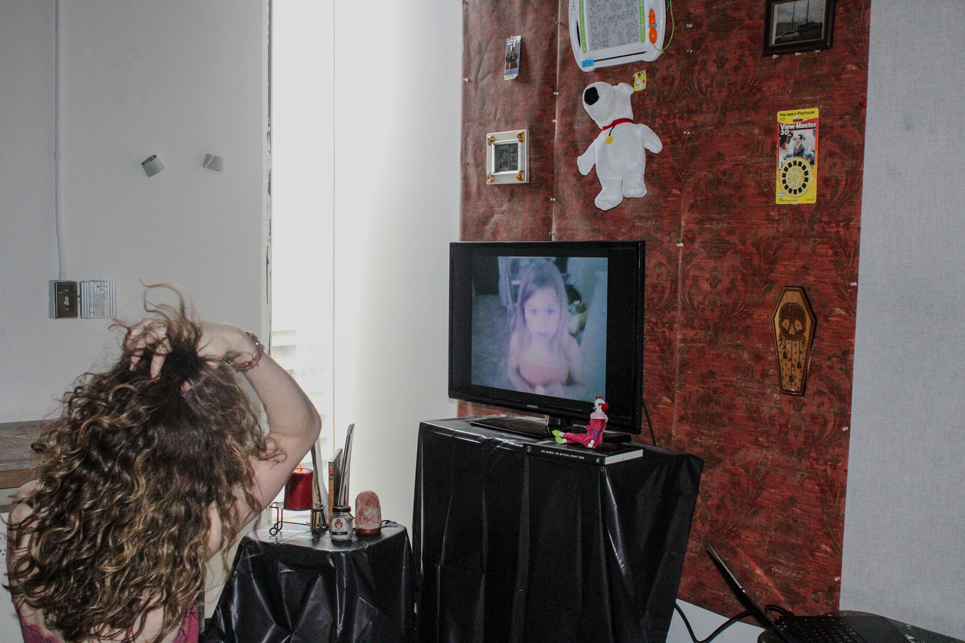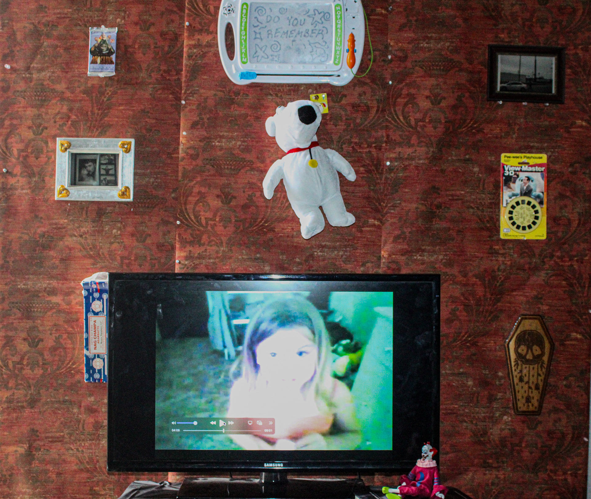 When I was younger my dad made a film of me growing up. He is an artist himself after all even if he refuses to admit it. It's some of the only real moving footage I have of myself as a kid. Only things to fill the blurring memories of my summers down at his old apartment. In this video and instillation I tried to recreate that feeling. Going as far to document the long journey to pick up the dvd at his house to hang in picture frames on the walls. Taking his art and turning it into my own.